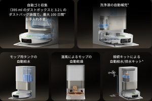 ベースステーションでのゴミ自動収集、給排水タンク、モップの自動洗浄・乾燥機能により、日々のメンテナンスがほぼ不要になる点が高く評価されています。